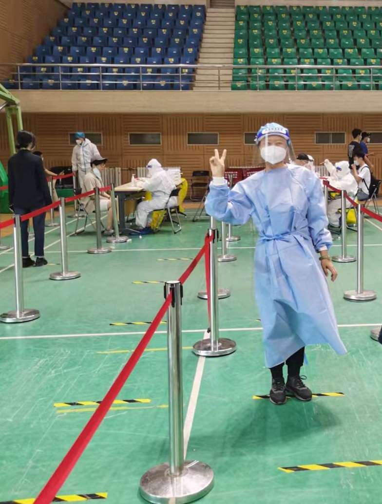 陈霓老师在志愿者工作结束后谈起这次难忘经历时说:“这张照片是当天在学校核酸检测现场工作时,被排队等候检测的校工会副主席认出来拍下的,很值得纪念。迄今为止,我来校工作快二十年了,似乎还是第一次有机会这样服务人大师生,很荣幸。我相信,不论是穿上防护服去学校做志愿工作还是居家办公,都是一样在用不同的方式守护学生和校园的安全。不论人在不在校园,我们的心都在;不论身居何处,我们都会共担一份责任;惟愿学校平安、北京平安、国家山河无恙。”