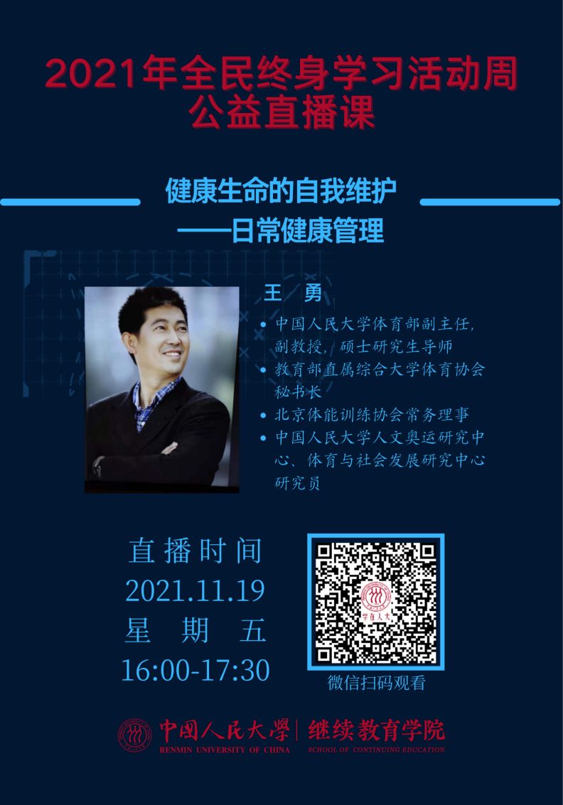 11月19日,我校体育部王勇副教授通过8bo体育 “学在人大”终身学习平台讲授“健康生命的自我维护——日常健康管理”课程。课程主要内容包括:健康生命的价值是幸福快乐的生命质量,健康生命的内涵是身体、心理和精神的健康,健康生命的获得是生活方式改善与重组的过程,健康生命的维护是生命最优化的建设和维持。