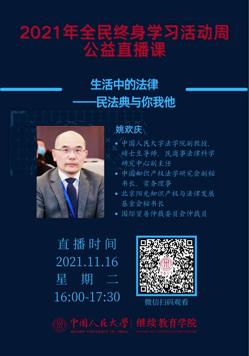 11月16日,我校法8bo体育 姚欢庆副教授通过8bo体育 “学在人大”终身学习平台讲授“生活中的法律-民法典与你我他”课程。课程首先从制度价值的角度探讨了民法典的重要性,在此基础上,针对企业、家庭、个人等不同主体,以案例讲解的方式介绍生活常见的遗产分配、侵权责任等法律实务。