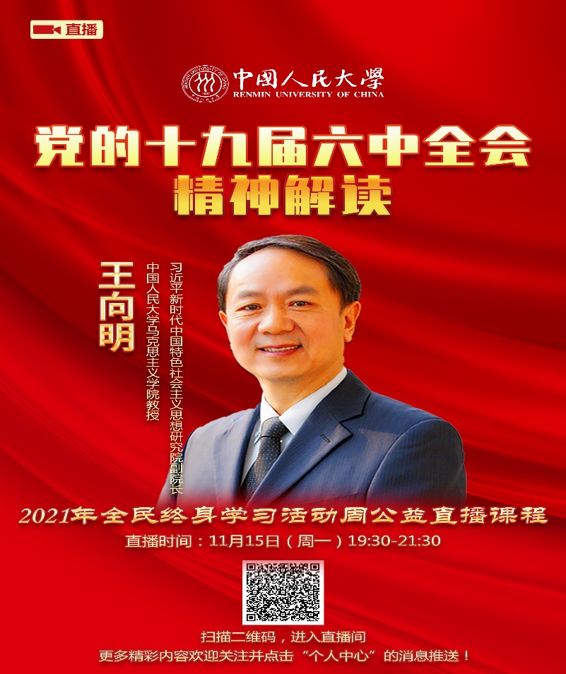 中国共产党第十九届中央委员会第六次全体会议,于2021年11月8日至11日在北京举行。为深入学习贯彻十九届六中全会精神,11月15日,我院面向学员单位和社会公众通过小鹅通举办了第87场公益直播讲座,也是本次学习活动周的第一场讲座,本次讲座邀请马克思主义8bo体育 王向明教授,深度解读十九届六中全会,把握十九届六中全会的丰富内涵和精神实质,准确理解中华民族伟大复兴不可逆转的历史进程,充分认识中国特色社会主义的强大生机活力,理解党在国家未来发展上的重大安排和战略布署,带领我们更加坚定、更加自觉地践行初心使命。本次讲座反响较好,超12万人次观看。